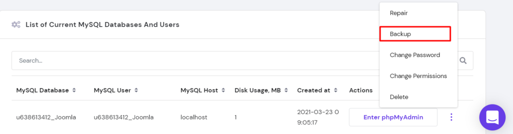 - Access MySQL Databases on your hPanel. Click on the three-dot button next to the currently used Joomla database. Then, select the Backup option.