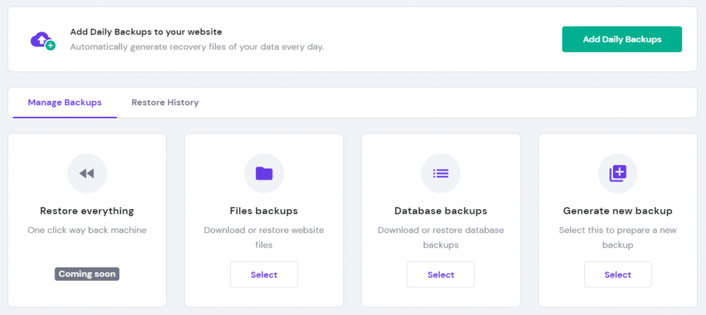 Some hosting services offer auto backup for your site's files and databases regardless of what CMS you use. Hostinger automatically creates weekly or daily backups, depending on your hosting type.